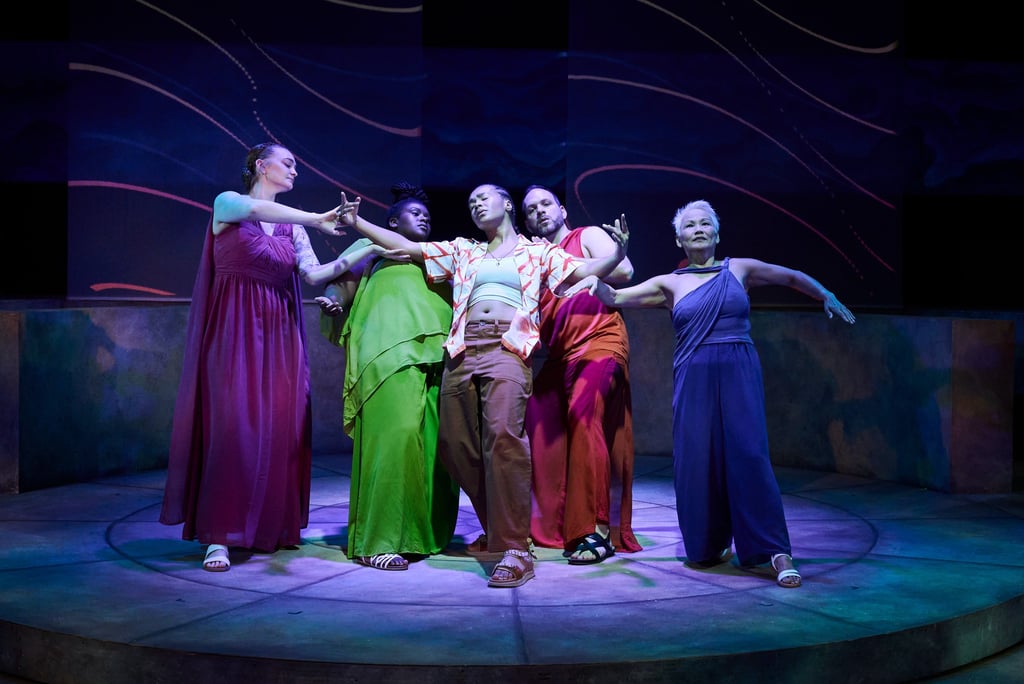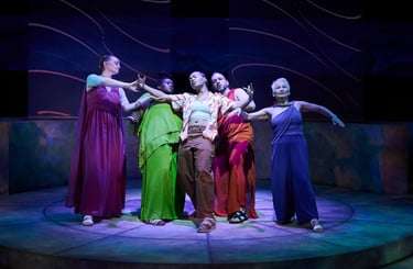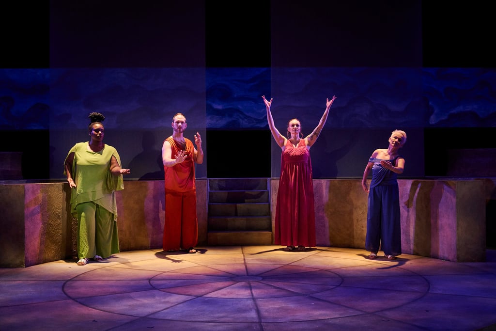 The staging is bilingual in ASL and English, and sometimes it even incorporates Greek Sign Language (GSL), resulting in something truly inventive. Each character is shadowed by a chorus dressed in ancient Greek style, who voices or signs their thoughts, making the inner life of each character theatrically legible and serving as their ego, or the id. The four choruses are played by Amelia Hensley, Thomas DellaMonica, Hope Anthony, and Monique Holt. All the chorus-character pairs wear matching costumes in the same color scheme. Following the ancient Greek tradition, the choruses also advance the storyline and occasionally serve as the narrators.