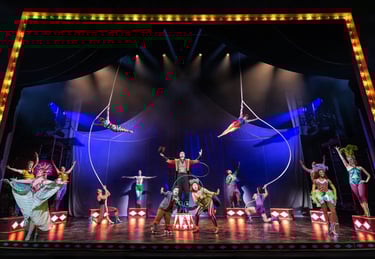 Water for Elephants is a no-doubt true showstopper, and I find it hard to select a single aspect to praise because there are so many stunners throughout the performance. First premiered in the Alliance Theatre (Atlanta) in 2023, then as a Broadway musical in 2024, it has been on its national tour since 2025 and is now performing in Pittsburgh as part of the Cultural Trust’s PNC Broadway in Pittsburgh series. As a touring production, it no doubt feels extremely polished and neat. The meticulousness enables the production’s complexity, allowing the large ensembles of actors, acrobats, aerialists, and puppeteers to create thrilling moments on stage and maintain the sheer coordination needed to make them happen aesthetically and safely. The performance is full of dazzle and a maximalist aesthetic, with every moment feeling “full,” if not “fullest,” with the set design, lighting, puppetry, choreography, singing, and so much more. The fun of the performance lies in the spectacle’s nonstop sequences.